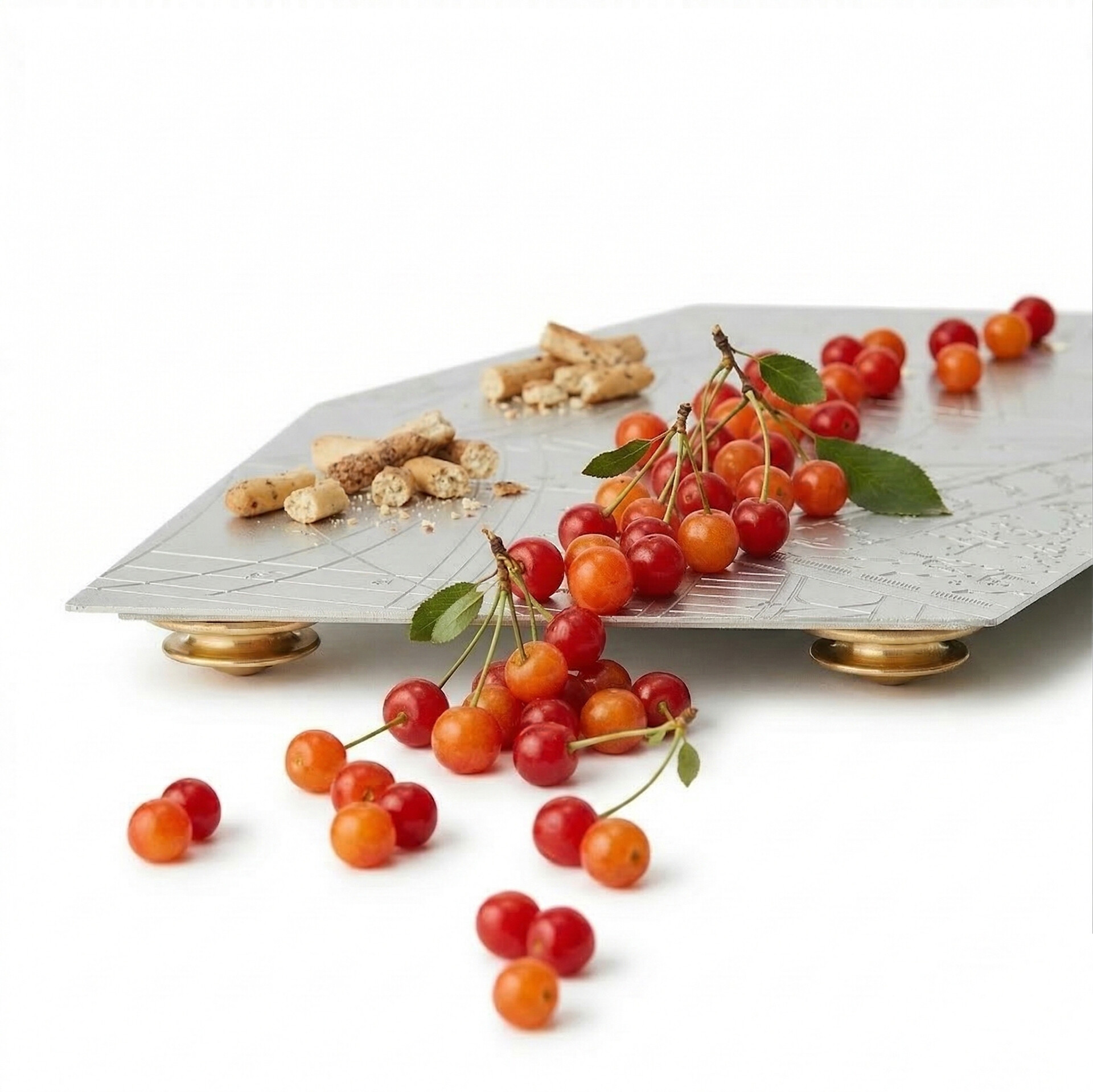 트레이로서 그릇이나 컵을 올려두는 실용적인 기능과 함께, 우리가 상상하는 ‘우주 정원’의 장면 위에 다양한 정물들이 놓여지는 하나의 stage로 존재합니다.
